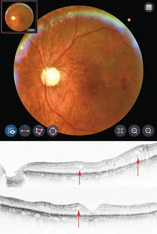 Al indicar capas en diferentes colores, es fácil verificar y comprender la patología de una enfermedad. En caso de comparación para la retinopatía diabética, el modo ayuda a rastrear la patología y establecer un plan de tratamiento.