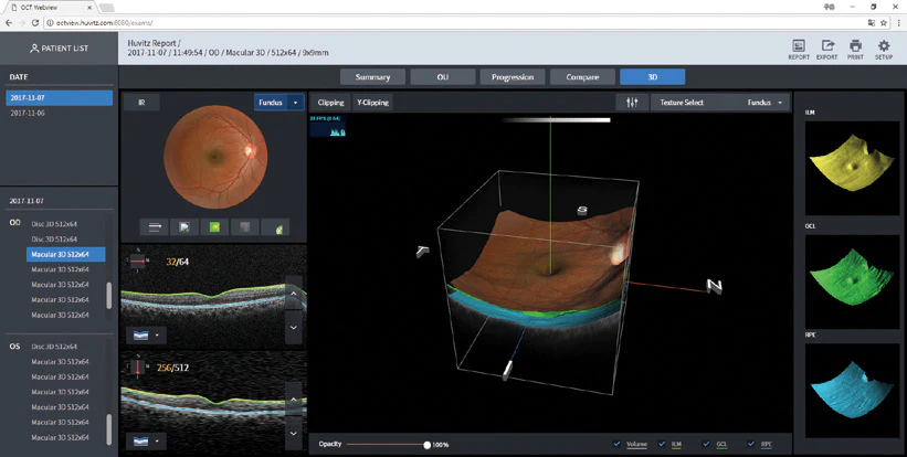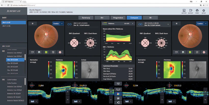 Los usuarios pueden analizar con Single Eye, OU, o funcionalidad de comparación. También es posible comprobar cambios clínicos después del tratamiento o la cirugía con la función de progresión.